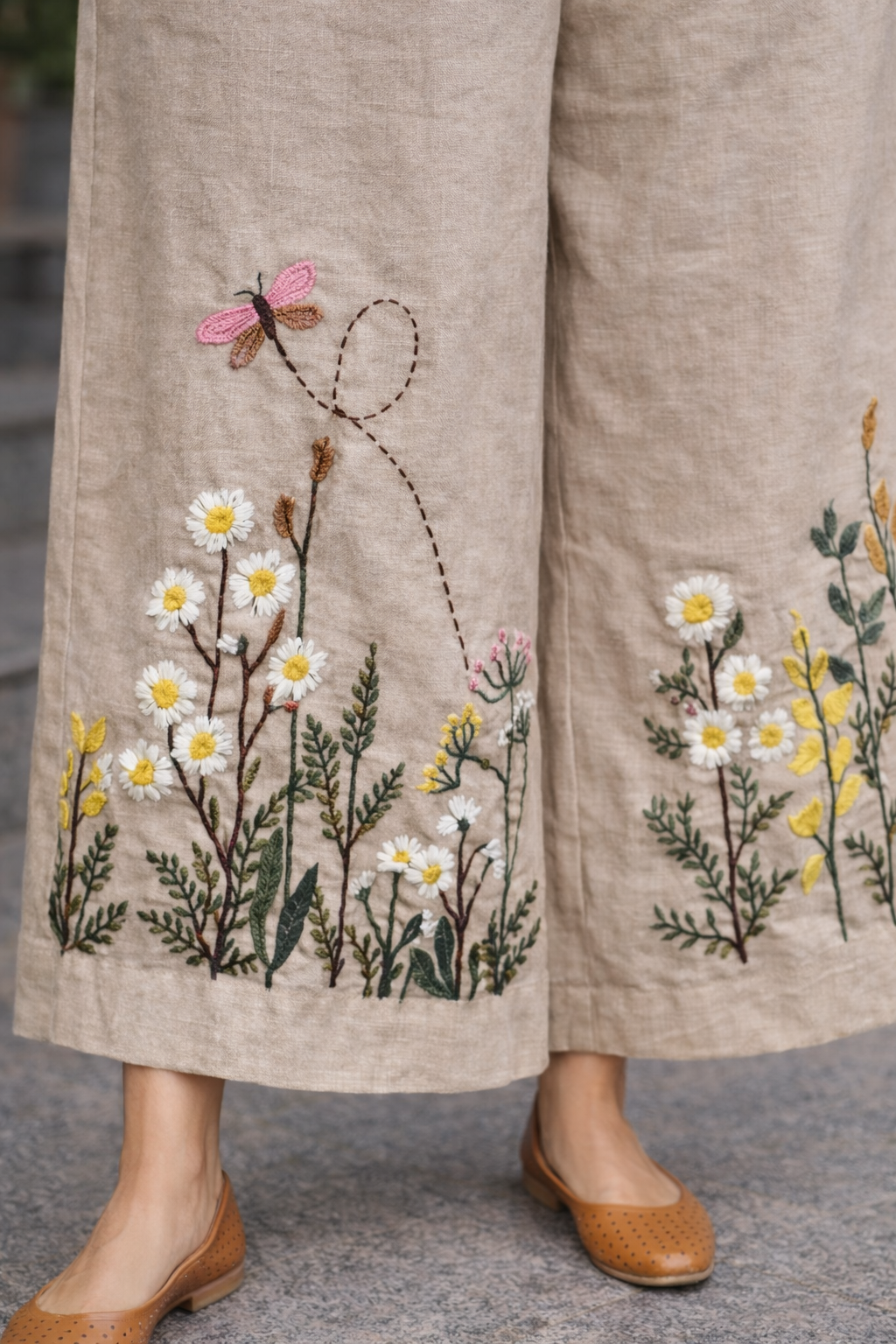 The wide-leg pants complement the top perfectly, creating a balanced and fashionable ensemble. The lower portion of the pants showcases beautiful embroidered floral motifs with delicate stems, daisies, and a charming dragonfly detail that adds a playful artistic element. This intricate embroidery gives the outfit a handcrafted and premium feel.